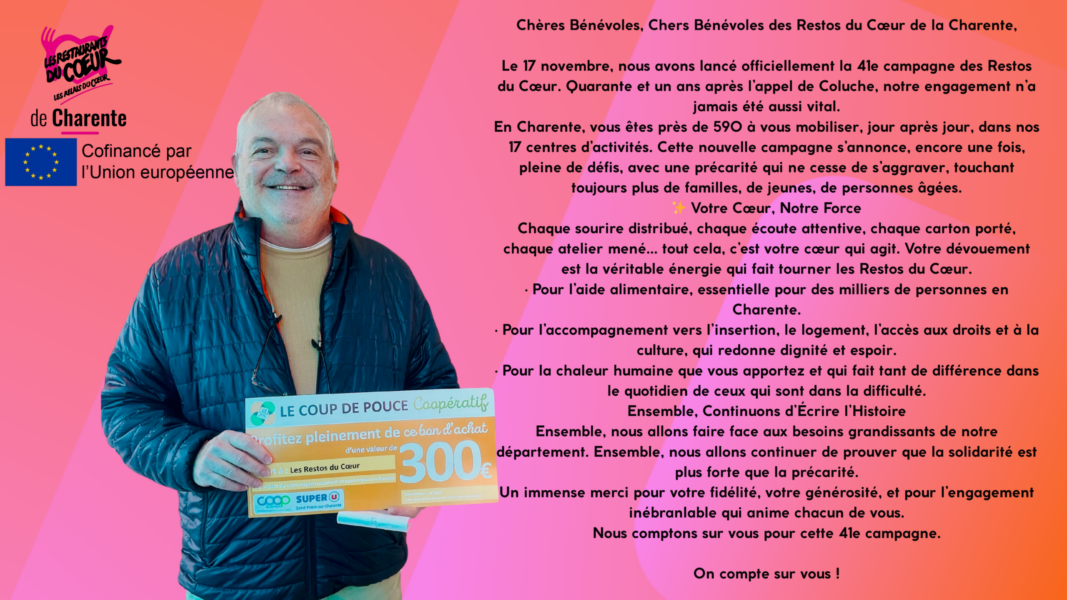 La 41e campagne des Restos du Cœur a été lancée le 17 novembre. En Charente, près de 590 bénévoles engagés dans 17 centres font face à une précarité croissante touchant de plus en plus de personnes. Leur engagement est essentiel, tant pour l’aide alimentaire que pour l’accompagnement vers l’insertion, le logement, l’accès aux droits et la culture. Grâce à leur dévouement et à la chaleur humaine qu’ils apportent, la solidarité continue de faire la différence. Un grand merci est adressé à tous les bénévoles pour leur engagement indispensable dans cette nouvelle campagne.